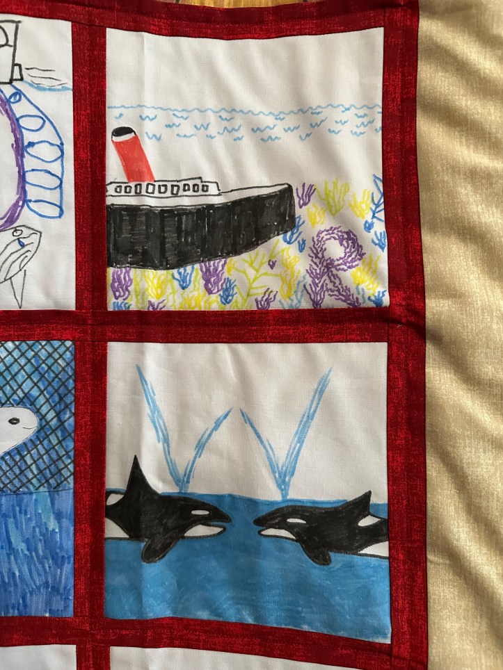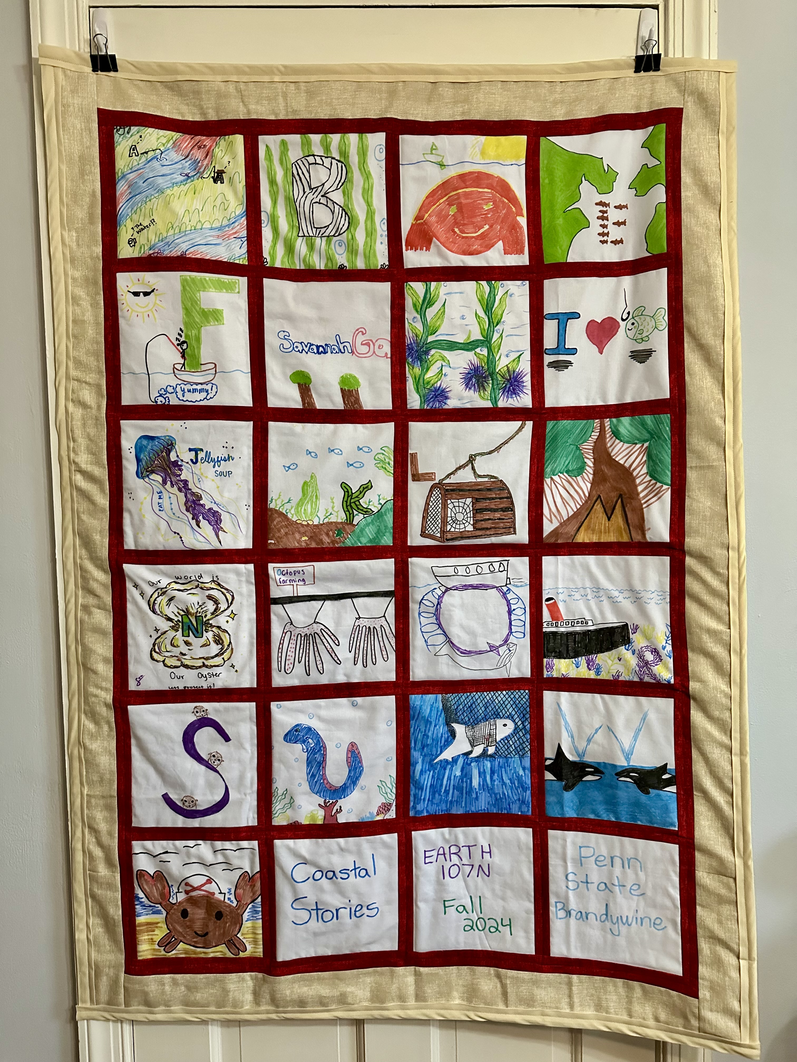 When I taught coastal oceanography in Fall Semester 2023, I had the students in each section of the course author stories relating to coastal climate solutions. These solutions are ones researched and modeled by Project Drawdown. To wrap up their project, students drew an image relating to their stories on fabric squares, which resulted in two collaborative student quilts on Coastal Climate Solutions.