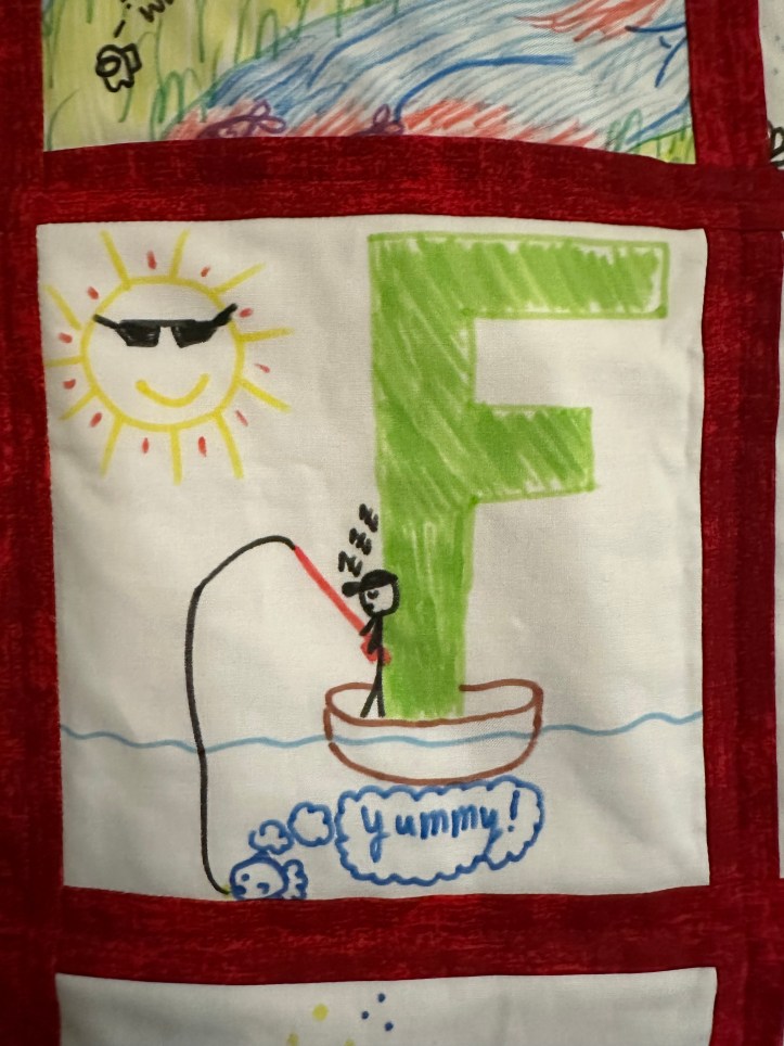Unfortunately, with some students dropping the course during the semester, we lost some letters of the alphabet. But I still went through and finished stitching the quilt in honor of the work completed by the students. The squares correspond to the following letters and articles.