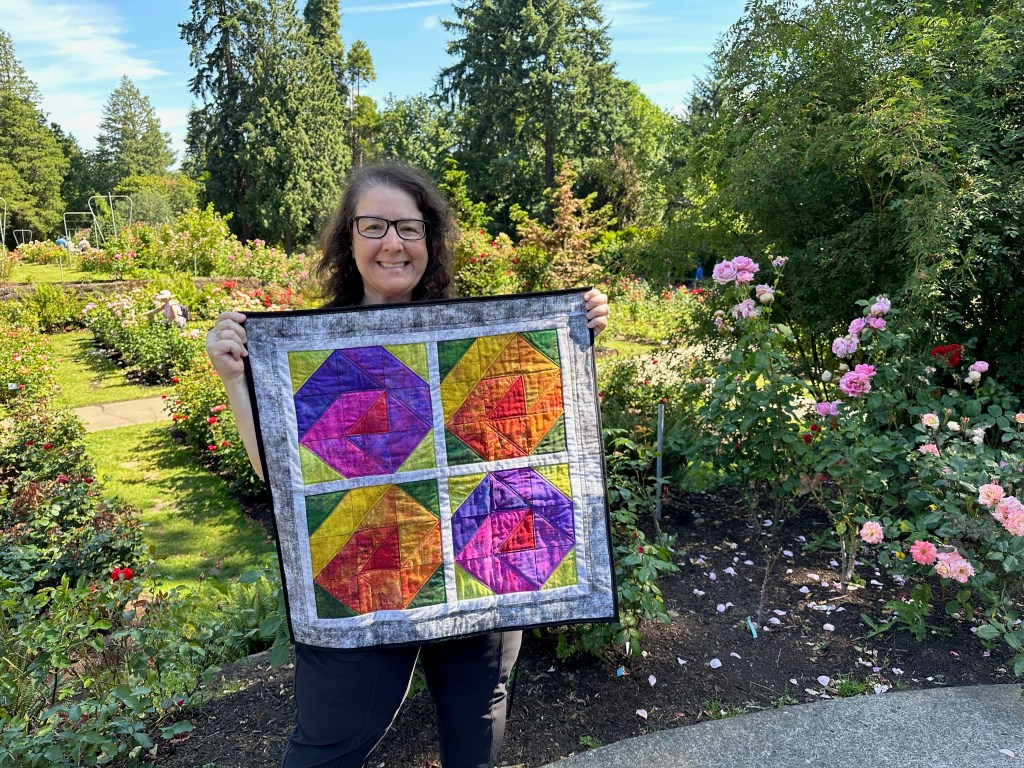 This time, the plan worked! Just over a year later, in June 2025, my husband and I made it back to the west coast, made the trip to Sister’s Quilt Shop in Washington, and then we went to the rose garden with the quilt. The grunge fabric is not what one would expect for a quilt with flowers, and I wasn’t sure when I started making the quilt if I would like the result. But when you tie in the name (a nod to grunge rock from the Pacific northwest and the group Guns N’ Roses) and the backing fabric, it all works for me.