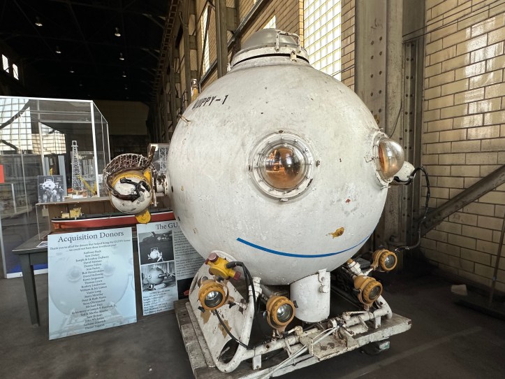 Formerly on display at the Independence Seaport Museum in Philadelphia, you can now see GUPPY during a tour at the National Iron & Steel Heritage Museum, located on the 120″ Mill Complex Property where the Motor House building is being used for large exhibits. You can read about GUPPY’s “coming home” to where its steel heads for the pressure hull were made, in the Spring 2018 issue of the Museum’s BoilerPlate Magazine.