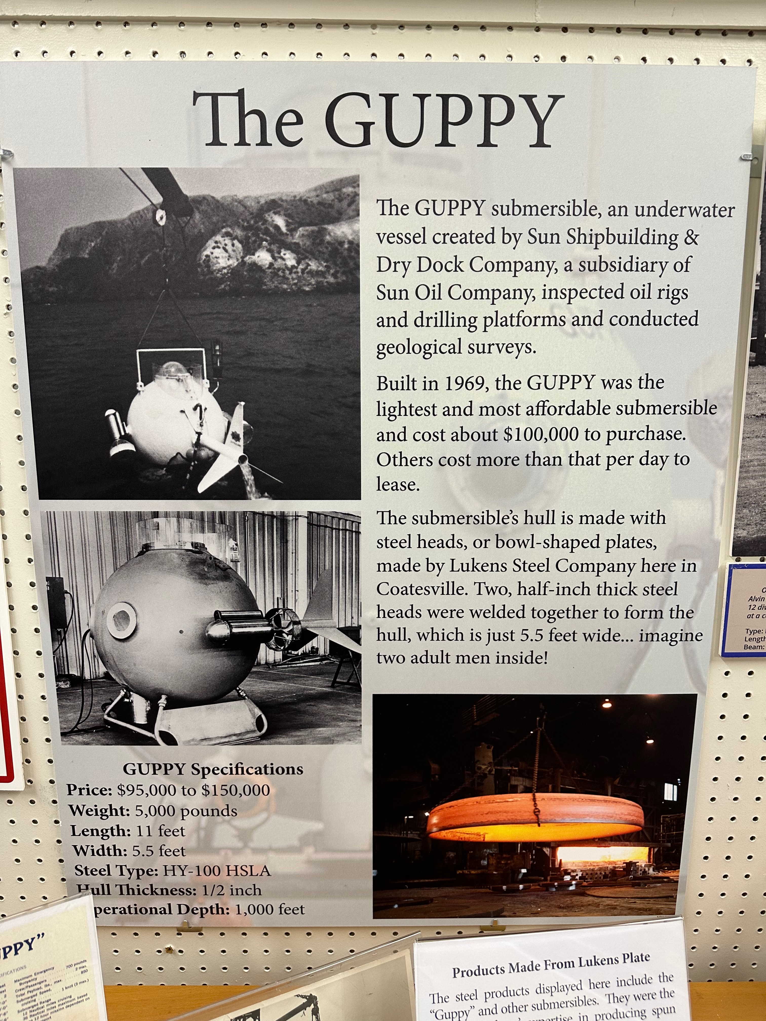 Sun Shipbuilding & Dry Dock Company, where GUPPY was constructed, is not far away from Coatesville (~30 miles). Lukens was a big provider of steel for ship construction at the Sun facilities in Chester, PA, such as Glomar Explorer. You can view a series of historic images from GUPPY’s construction and early testing at the NISHM website.
