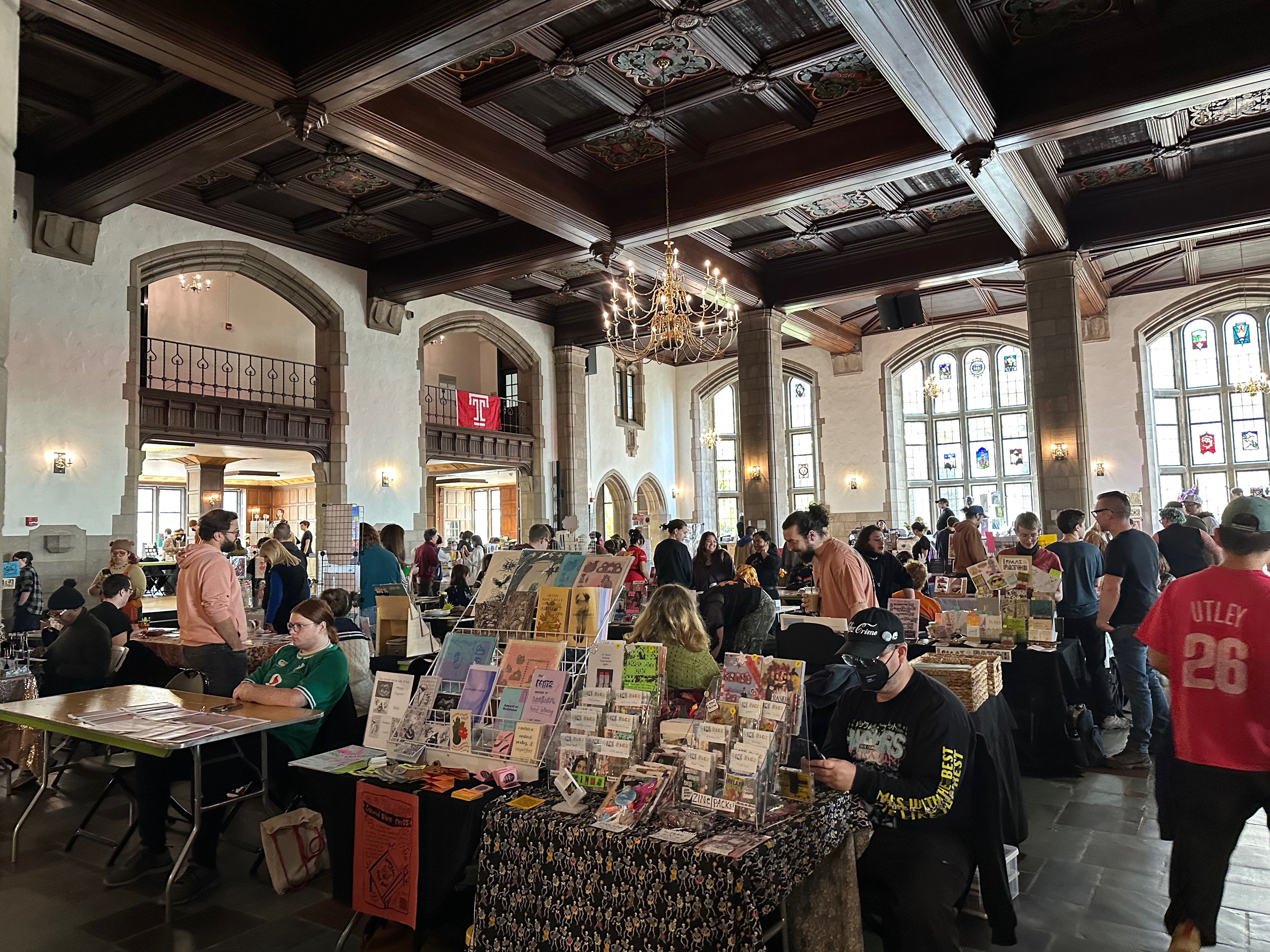 A view inside Mitten Hall at Temple University of the Philly Zine Fest. There was one main room and two side rooms filled with zines, stickers, fabrics, and more.