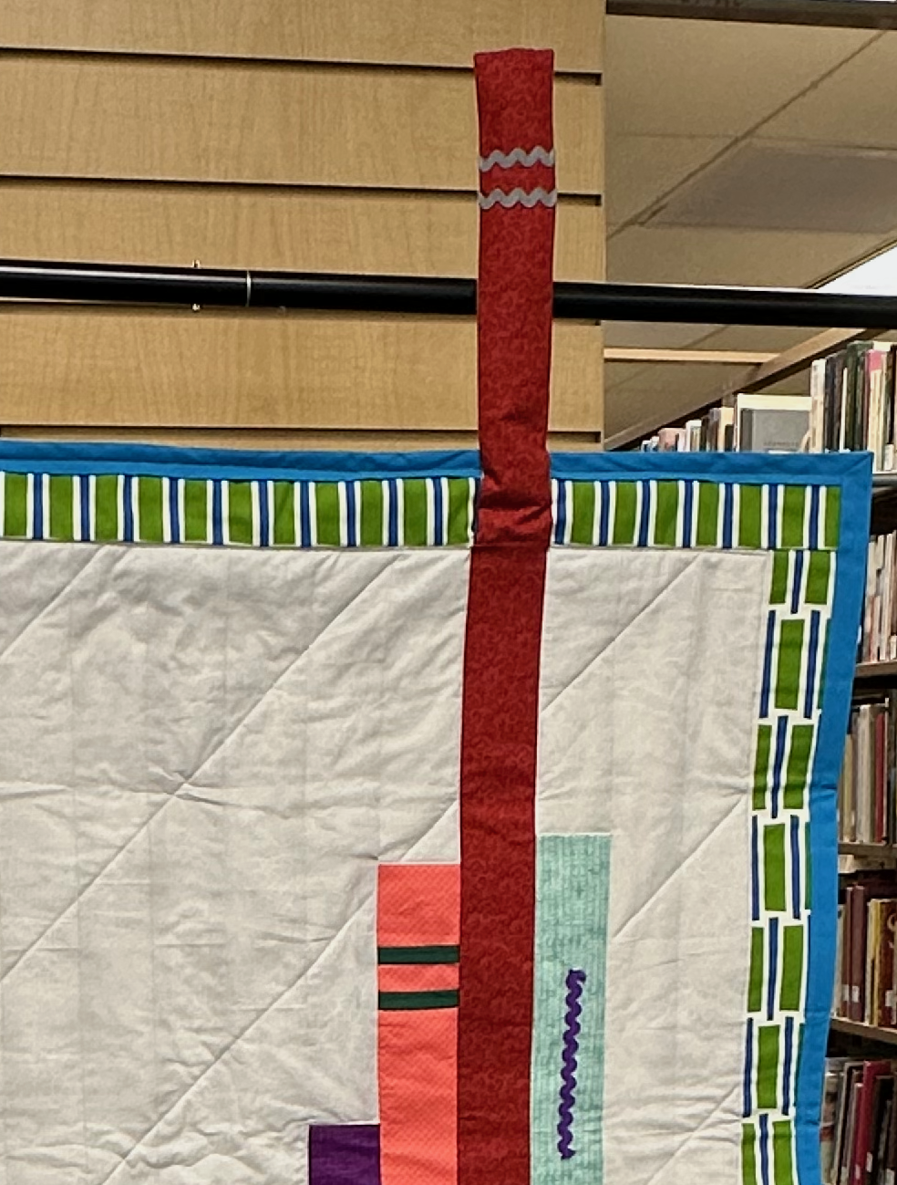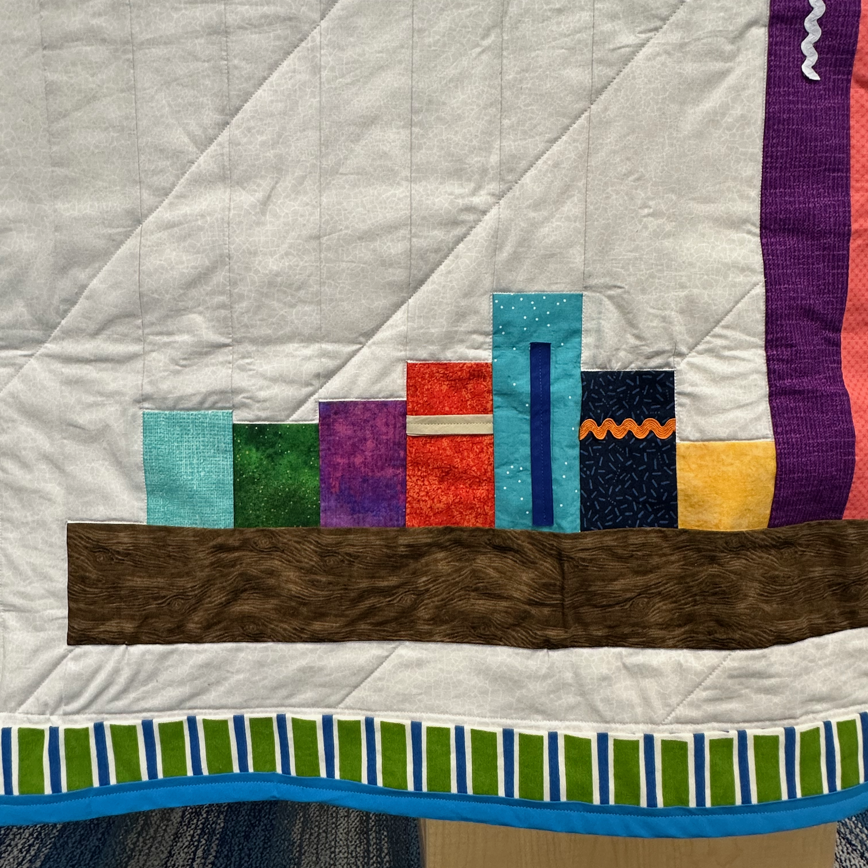 While constructing the quilt, Annie and Laura became concerned with the overall size, especially when scaling the numbers for each year – the 2023 data would have added much more height to the quilt. So Annie came up with the idea of having this bar/book break through the top of the quilt to call attention to this large value.