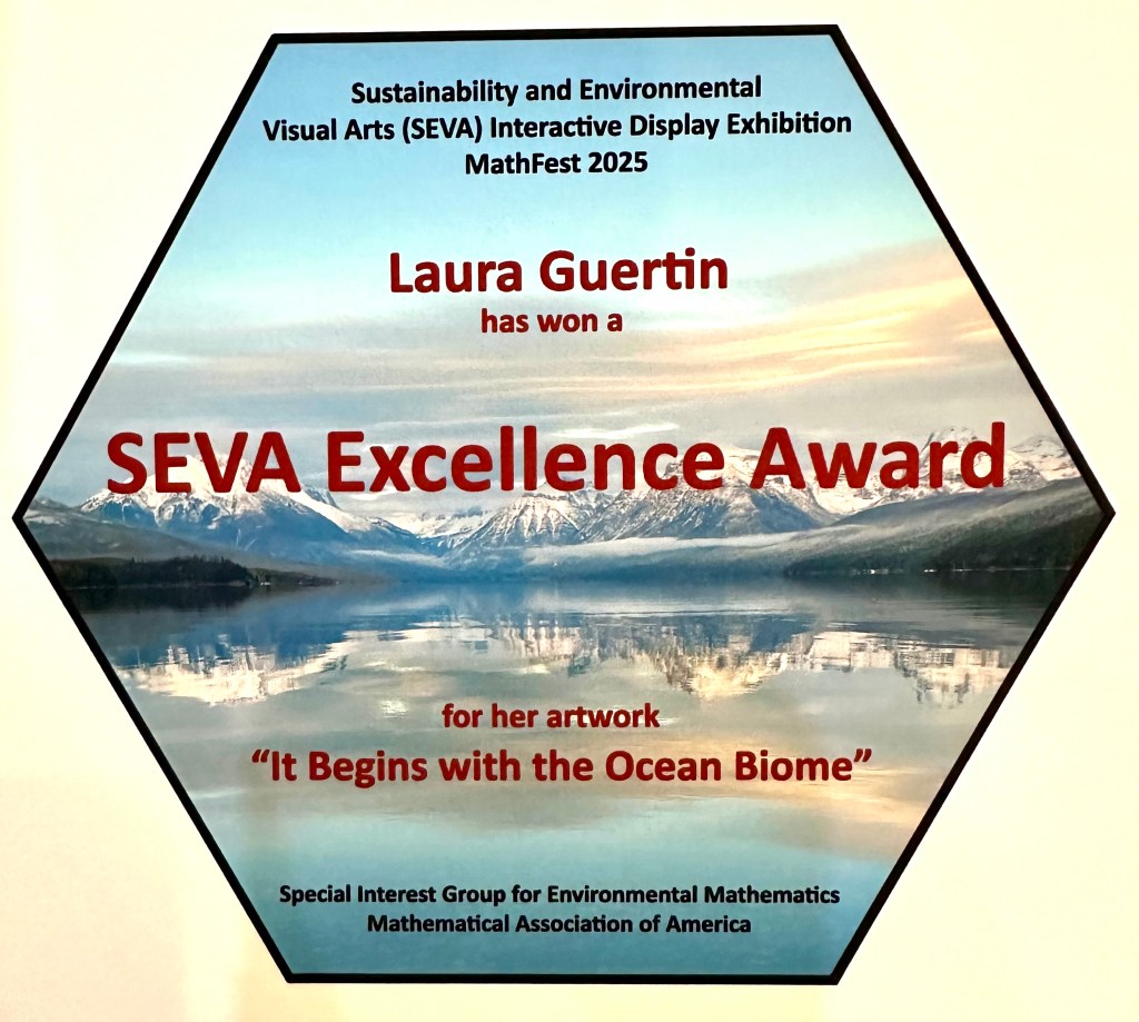 The Special Interest Group for Environmental Mathematics of the Mathematical Association of America (MAA) hosted an exhibit in Sacramento, CA, set up as a tessellation of regular-hexagonal-shaped sustainability and environmental visual artworks. My quilt It Begins with the Ocean Biome was selected for one of the awards. A description of the quilt is available in this blog post, and I have included a short video overview of the quilt below.