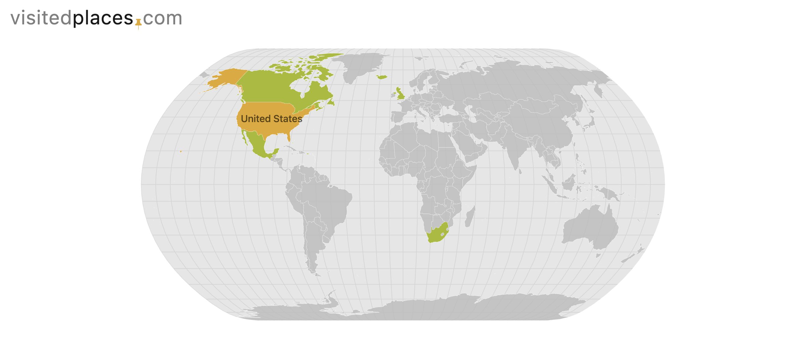 These are the countries I have visited – a long way to go on this one! So far – South Africa, UK, Iceland, Canada, Mexico, and the Bahamas.